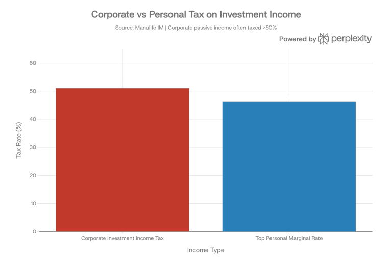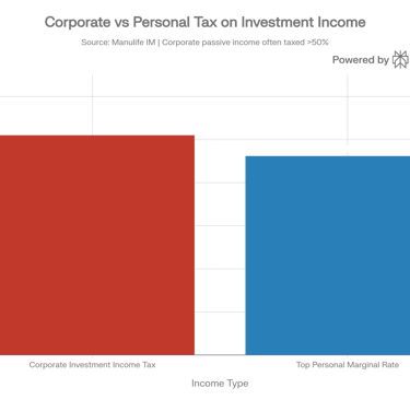 To put that in perspective: the top personal marginal tax rate in Ontario is approximately 46.16%, while corporate passive income can be taxed at 51% or higher. That means your corporation is not a shelter for investment income — it's a high-tax environment if you're not investing strategically.