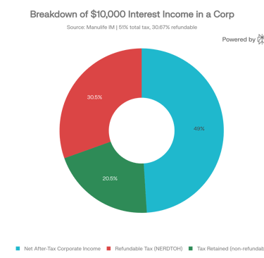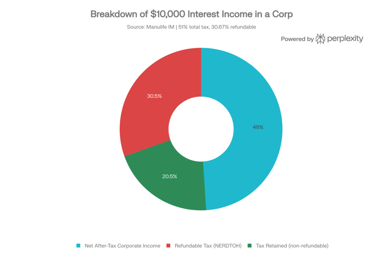 This is the least tax-efficient category. Interest from GICs, bonds, or savings accounts — as well as foreign dividends — is fully included in taxable income and taxed at the full passive income rate (up to 51%) . A portion (30.67%) is refundable and tracked in the Non-Eligible Refundable Dividend Tax on Hand (NERDTOH) account, meaning it can come back to the corporation when taxable dividends are paid to shareholders.