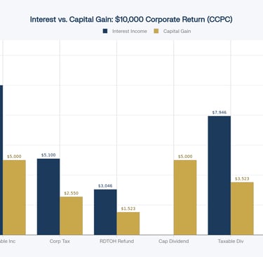 Capital gains are much more tax-efficient. Only half of a capital gain is taxable, meaning a $10,000 capital gain only generates $5,000 in taxable income . The non-taxable half gets added to the Capital Dividend Account (CDA) — a powerful tool that allows shareholders to receive those funds completely tax-free as a capital dividend.